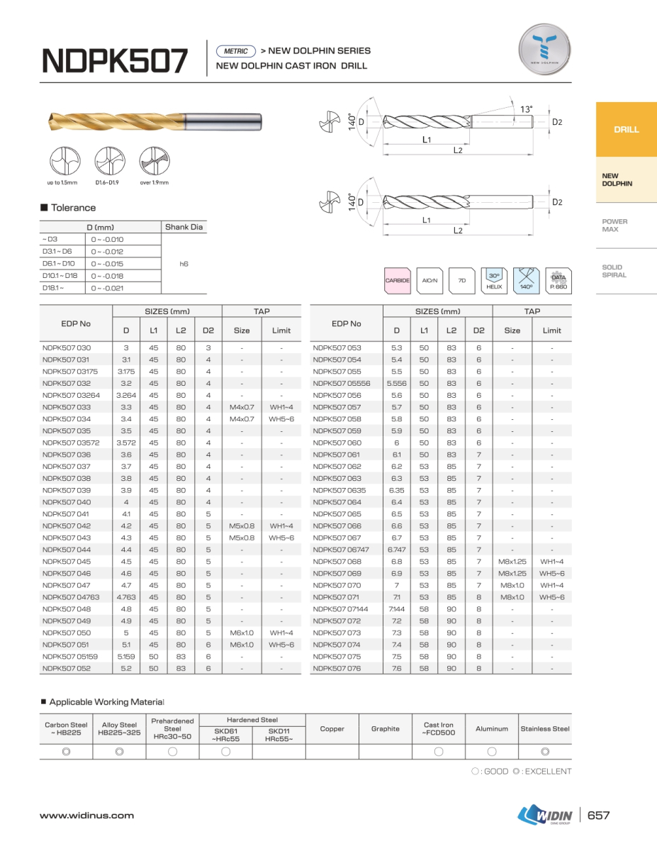 Mũi khoan Dolphin NDPK507 là mũi khoan hợp kim carbide dòng Dolphin 7×D của Widin, thiết kế chuyên gia công lỗ sâu với độ ổn định cao trên thép, inox, gang và vật liệu hợp kim. Hình học lưỡi cắt tối ưu với góc đỉnh 140° và góc xoắn 30° giúp giảm lực cắt ban đầu, cải thiện khả năng ăn dao và đảm bảo thoát phoi hiệu quả trong quá trình khoan. Cấu trúc rãnh xoắn kết hợp thiết kế lưỡi cắt đặc biệt giúp hạn chế kẹt phoi, duy trì độ ổn định khi khoan sâu, đồng thời nền carbide hạt mịn cùng lớp phủ chống mài mòn giúp tăng khả năng chịu nhiệt, chống oxy hóa và kéo dài tuổi thọ dụng cụ. Sản phẩm phù hợp cho các ứng dụng khoan CNC yêu cầu độ chính xác và hiệu suất cao trong gia công cơ khí.