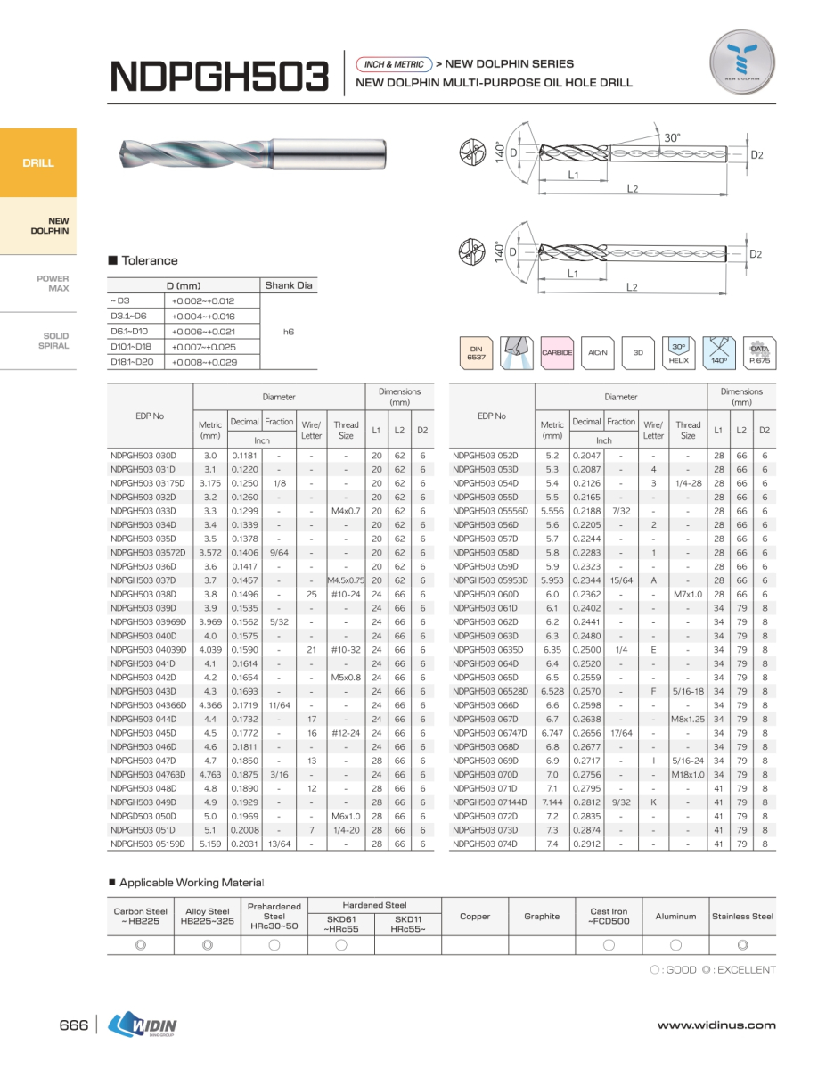 Mũi khoan tưới nguội xuyên tâm NDPGH503 là mũi khoan hợp kim carbide dòng Dolphin 3×D của Widin, thiết kế có lỗ dầu tưới nguội xuyên tâm (internal coolant) giúp đưa dung dịch làm mát trực tiếp đến vùng cắt, nâng cao hiệu quả tản nhiệt và hỗ trợ thoát phoi ổn định khi khoan. Sản phẩm sử dụng nền carbide hạt mịn với độ cứng và khả năng chống mài mòn cao, kết hợp hình học lưỡi cắt tối ưu với góc đỉnh 140° và góc xoắn 30° giúp giảm lực cắt ban đầu và duy trì quá trình gia công ổn định. Thiết kế rãnh xoắn hiệu quả giúp hạn chế kẹt phoi, đảm bảo độ chính xác lỗ khoan và chất lượng bề mặt, phù hợp gia công thép carbon, thép hợp kim, inox và gang trong các ứng dụng khoan CNC yêu cầu độ tin cậy cao.