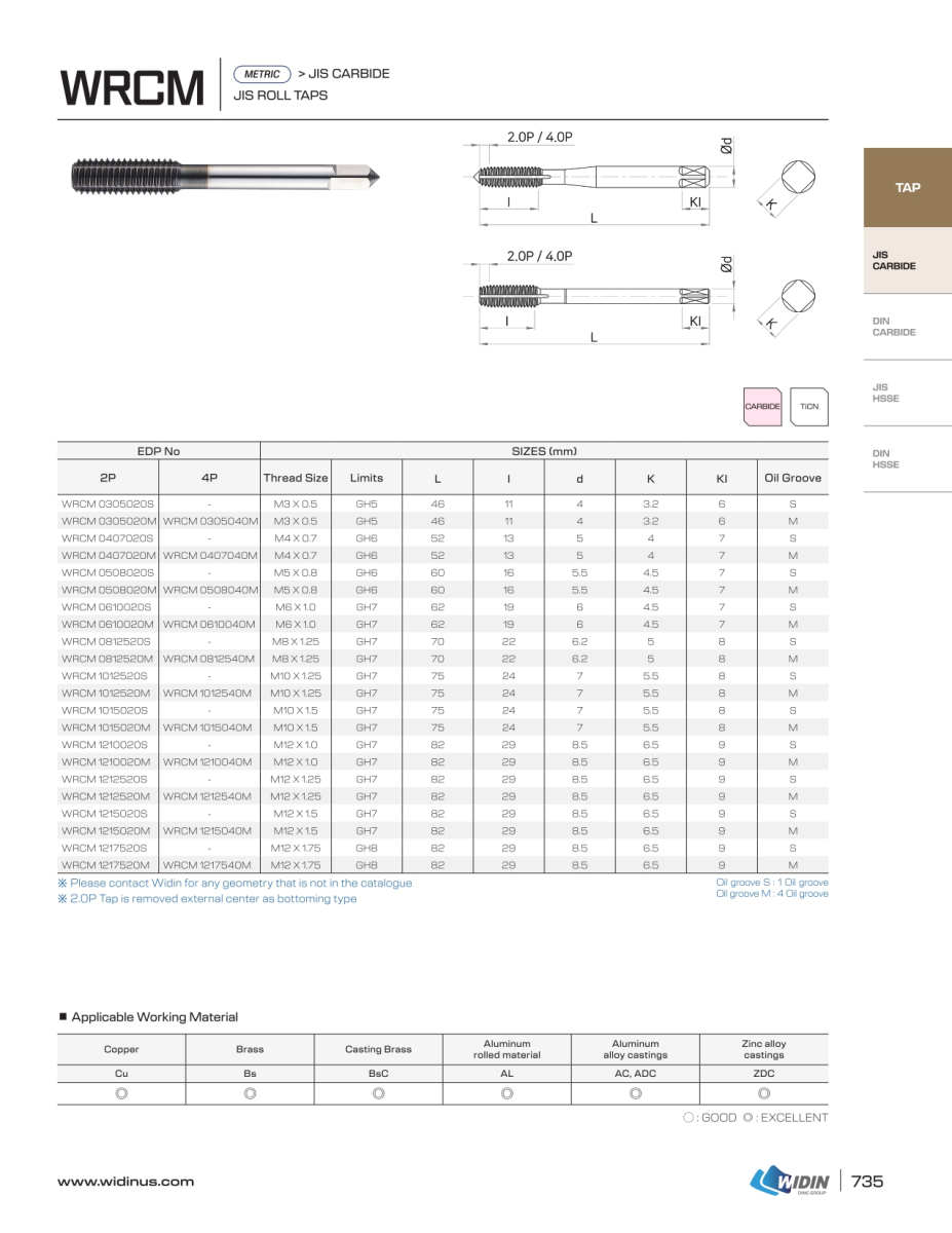 WRCM là mũi taro hợp kim dạng taro nén (roll tap) của Widin, thiết kế không rãnh thoát phoi, hoạt động theo nguyên lý biến dạng dẻo để tạo ren thay vì cắt gọt. Sản phẩm sử dụng vật liệu hợp kim (carbide) kết hợp lớp phủ TiCN giúp tăng độ cứng bề mặt, giảm ma sát và nâng cao khả năng chống mài mòn, từ đó kéo dài tuổi thọ dụng cụ. Do không sinh phoi, quá trình gia công diễn ra ổn định, hạn chế gãy taro và cải thiện độ bền ren. Mũi taro phù hợp gia công trên các vật liệu kim loại màu như nhôm, đồng và hợp kim, đáp ứng hiệu quả các ứng dụng taro CNC yêu cầu độ chính xác cao với dải kích thước từ M3 đến M12.