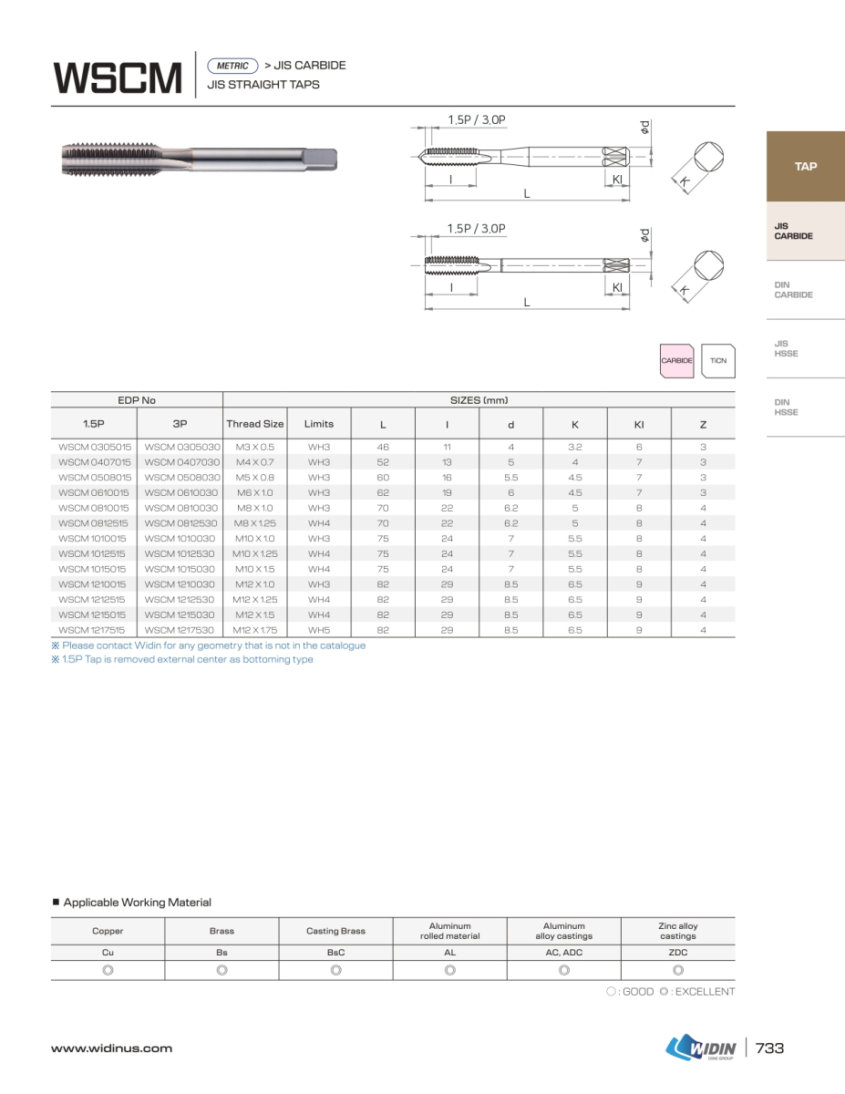 WSCM là mũi taro hợp kim rãnh thẳng (straight flute tap) của Widin, được thiết kế chuyên cho gia công ren lỗ thông với khả năng thoát phoi theo phương tiến của lưỡi cắt, giúp quá trình taro ổn định và hạn chế kẹt phoi. Sản phẩm được chế tạo từ vật liệu hợp kim (carbide) kết hợp lớp phủ TiCN giúp tăng độ cứng bề mặt, khả năng chống mài mòn và kéo dài tuổi thọ dụng cụ. Thiết kế rãnh thẳng cho khả năng dẫn hướng tốt, tạo ren đều, chính xác và giảm rung động khi gia công. Mũi taro phù hợp gia công trên nhiều vật liệu như thép, gang, nhôm và đồng, đáp ứng hiệu quả các ứng dụng taro CNC yêu cầu độ ổn định và độ chính xác cao.