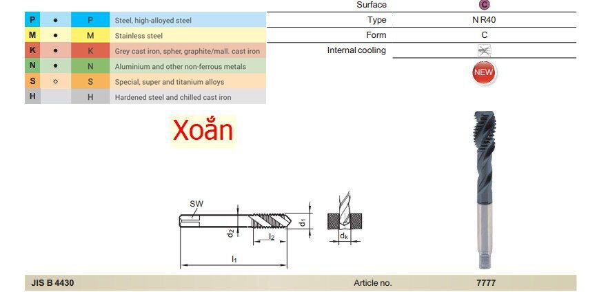 Mũi Taro Xoắn Guhring 7777, JIS, HSS-E, TiCN là dòng mũi taro xoắn chuyên gia công lỗ bít, được thiết kế để thoát phoi hiệu quả khi taro ren trong thép và vật liệu cơ khí thông dụng. Sản phẩm sử dụng vật liệu HSS-E kết hợp lớp phủ TiCN giúp tăng độ bền dao, ổn định quá trình cắt và nâng cao chất lượng ren trong gia công công nghiệp.