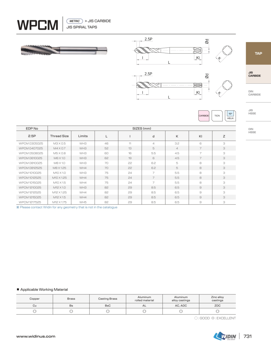 WPCM là mũi taro rãnh xoắn (spiral flute tap) của Widin, thiết kế chuyên cho gia công ren lỗ mù với khả năng kéo phoi ngược lên trên, giúp hạn chế kẹt phoi và đảm bảo quá trình cắt ren ổn định. Sản phẩm được chế tạo từ thép gió hợp kim (HSSE) kết hợp lớp phủ TiCN giúp tăng độ cứng bề mặt, khả năng chống mài mòn và giảm ma sát trong quá trình gia công. Hình học rãnh xoắn tối ưu giúp giảm lực cắt, cải thiện độ chính xác ren và nâng cao chất lượng bề mặt. Mũi taro phù hợp gia công thép carbon, thép hợp kim, gang và kim loại màu, đáp ứng tốt các ứng dụng taro CNC yêu cầu độ ổn định và tuổi thọ dụng cụ cao.